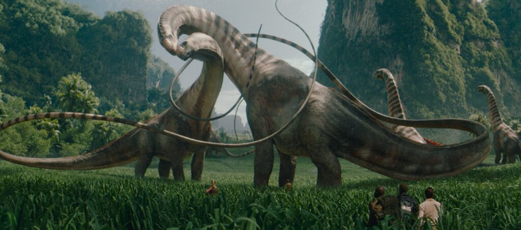 Se for para elencar bons momentos, diríamos que visualmente, o filme impressiona. Uma sequência contemplativa com titanossauros em seu habitat natural é, sem dúvida, uma das mais bonitas.